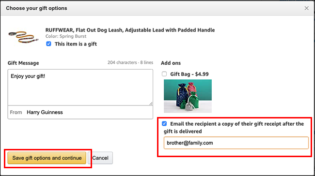 无论您选择哪个选项,结帐时都会向您显示“添加礼物选项”屏幕。要添加礼物收据,请选中“在礼物送达后通过电子邮件向收件人发送礼物收据副本”复选框,添加他们的电子邮件地址,然后单击“保存礼物选项并继续”。