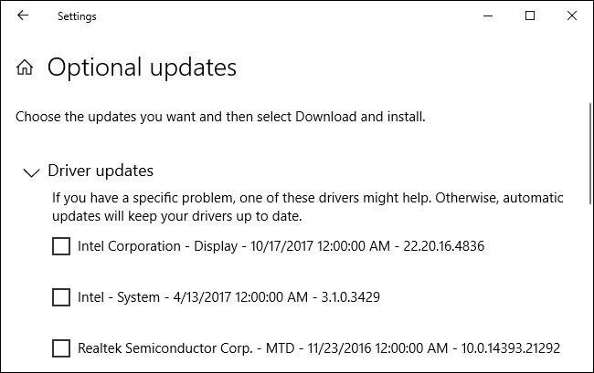 要安装可选的驱动程序更新,只需选中它,然后单击列表底部的“下载并安装”。