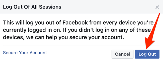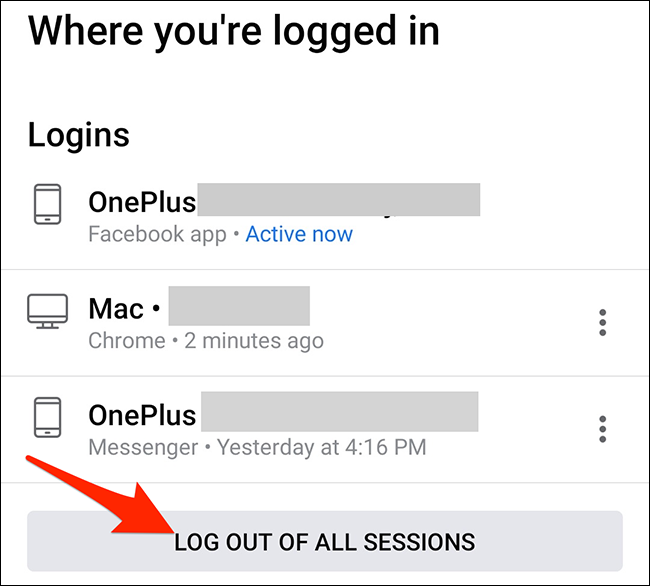 您将看到使用 Facebook 帐户的设备列表。要退出所有这些设备,请单击“登录位置”部分右下角的“退出所有会话”。