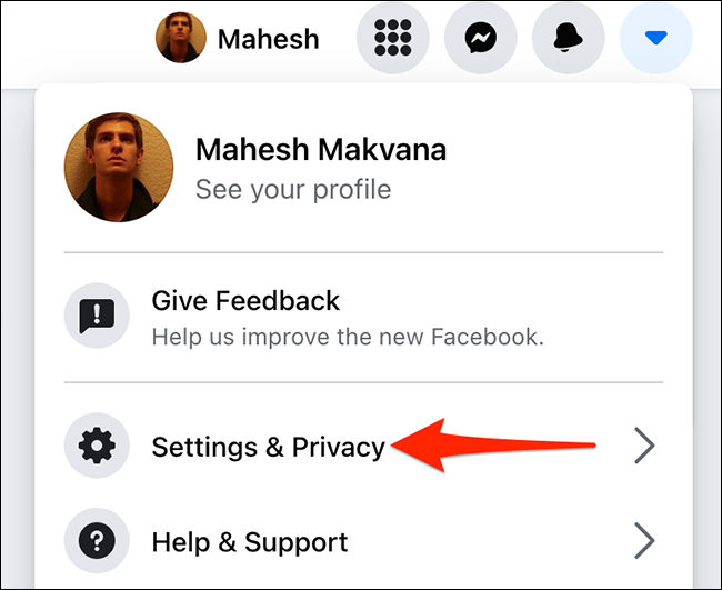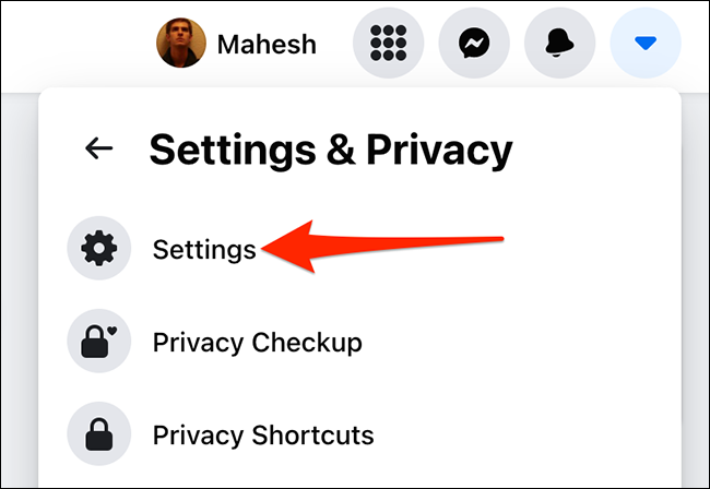 从向下箭头图标菜单中,选择“设置和隐私”。