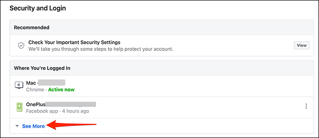 在打开的“安全和登录”页面上,从“您登录的位置”部分,单击“查看更多”选项。