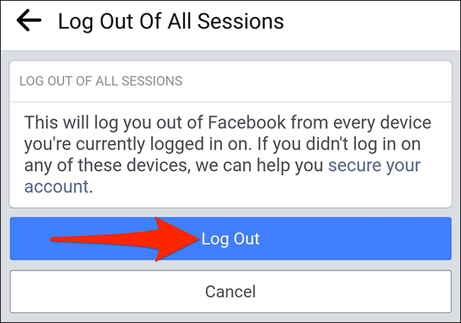 Facebook 将显示您使用帐户的设备列表。在此屏幕的底部,点击“退出所有会话”。