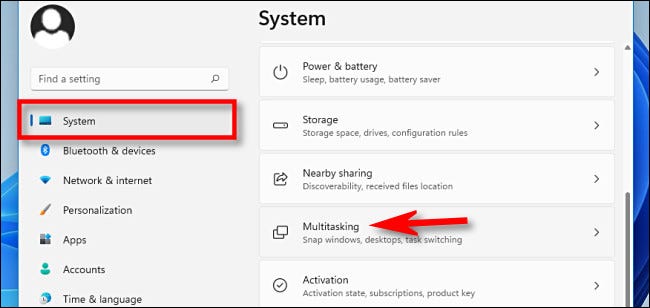 在“设置”中,单击边栏中的“系统”,然后向下滚动并选择“多任务处理”。