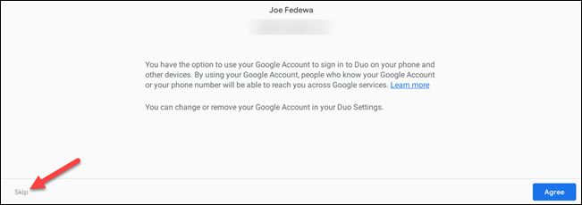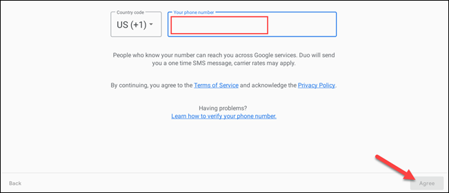 现在,您可以输入与您要使用的其他 Google Duo 帐户关联的电话号码,然后单击“同意”。