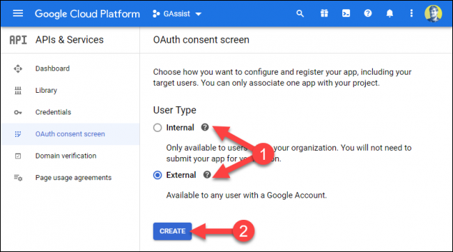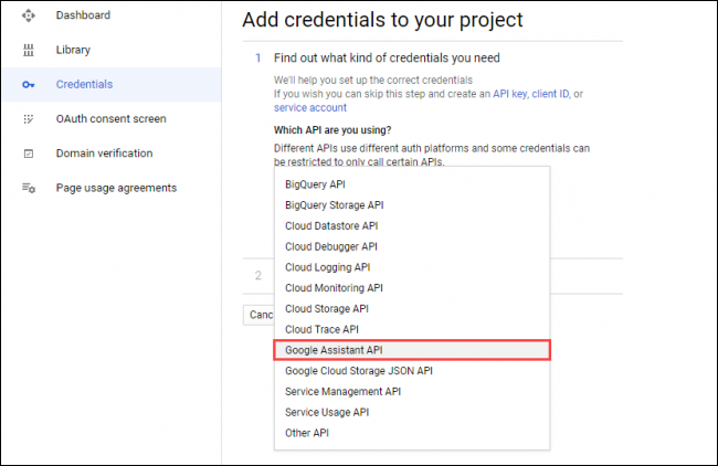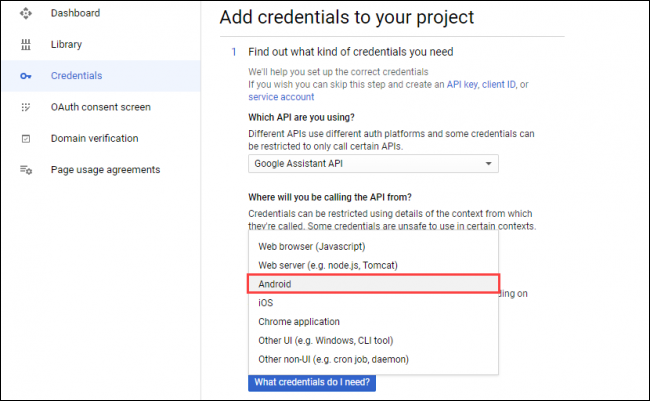 在“您使用的是哪个 API?” 下拉菜单中,选择“Google Assistant API”。