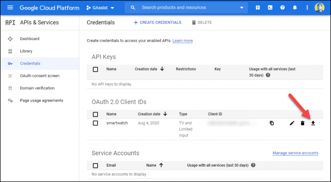 返回“凭据”选项卡,然后单击您刚刚创建的“OAuth 客户端 ID”旁边的下载图标。