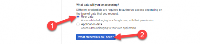 在“您将访问哪些数据?”下选择“用户数据” 然后,单击“我需要什么凭据?”