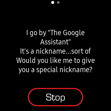点按“聆听”与 Google 助理交谈,它会响应您的命令。如果您的可穿戴设备有扬声器,您会大声听到响应。点击“停止”结束响应。