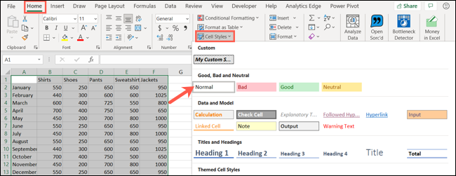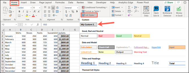 要使用自定义单元格样式,请选择单元格,转到“主页”选项卡,然后单击“单元格样式”。您应该在自定义下的选择框顶部看到您新创建的样式。单击以将其应用于您的单元格。