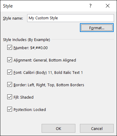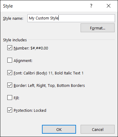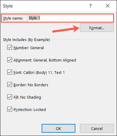 当样式窗口打开时,单击“格式”以在“单元格格式”窗口中进行调整,然后单击“确定”。在“样式”窗口中进行任何进一步更改,例如,如果您正在修改预制样式,则输入新名称,然后也单击“确定”。