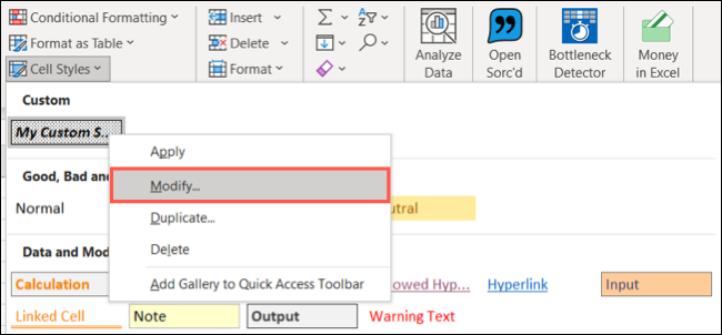 如果要更改您创建的自定义单元格样式甚至预制样式,请返回“主页”选项卡。单击“单元格样式”,右键单击要编辑的样式,然后选择“修改”。