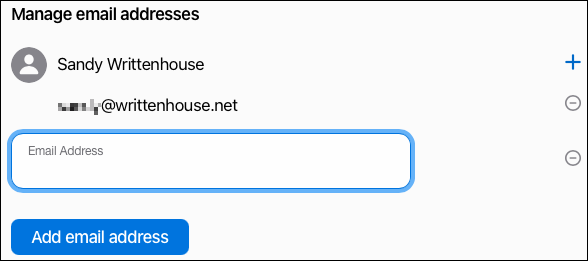 单击您姓名右侧的加号。输入新的电子邮件地址,然后单击“添加电子邮件地址”。