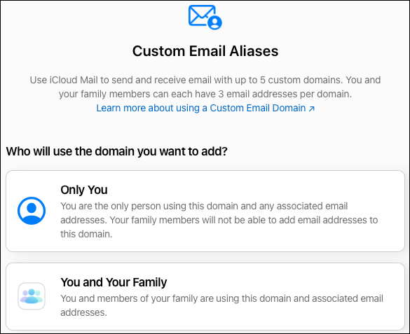 系统会询问您是要为自己还是为您和您的家人进行设置。如果您使用 家人共享,这将允许每个家庭成员使用域的三个电子邮件地址。选择“只有你”或“你和你的家人”。