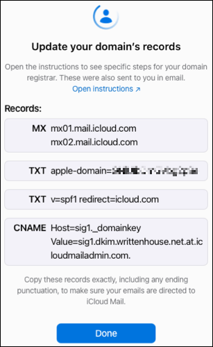 下一步是复制和更新您的域的记录。单击第 3 步的“查看”,您将看到一个窗口,其中包含您需要的设置。您可以选择并复制每条记录的文本。然后,只需将它们粘贴到您的注册商(例如 GoDaddy)的正确位置,或者如果您管理自己的 DNS,则修改您的区域文件。完成后单击“完成”。