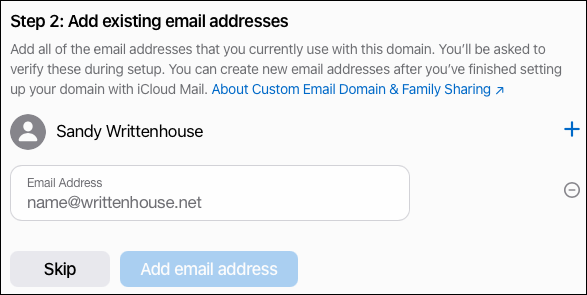 然后,添加您在第 2 步中在该域上使用的任何现有电子邮件地址。如果您当前未在该域上使用电子邮件地址,则可以单击“跳过”。完成域设置后,您可以创建新的电子邮件地址。
