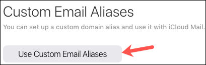 使用 iCloud 邮件设置域后,您可以根据需要创建新的电子邮件地址。返回 iCloud 上的自定义电子邮件别名部分,然后单击“使用自定义电子邮件别名”(或“管理”)。