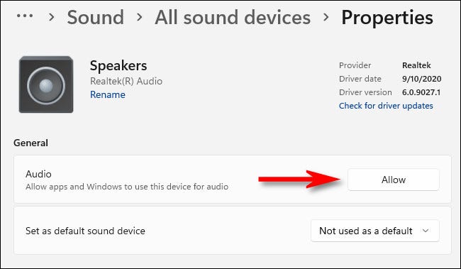 在设备的“属性”页面上,在“音频”下,单击“允许”按钮。