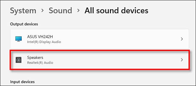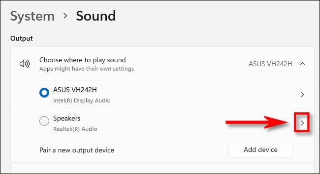 当“设置”打开“声音”页面时,找到靠近顶部的“输出”部分,然后单击要禁用的音频输出设备旁边的侧面插入符号(箭头)。