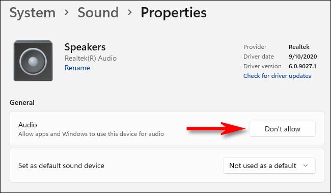 在声音设备的“属性”页面上,查看“常规”部分并找到“音频”选项,其下方显示“允许应用程序和 Windows 将此设备用于音频”。单击旁边的“不允许”按钮。