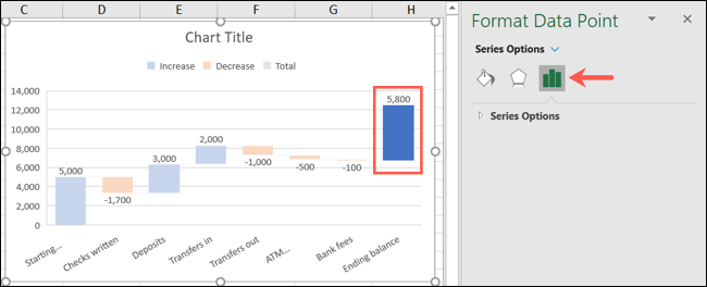 要解决此问题,请双击图表以显示格式侧栏。通过单击两次选择总计栏。单击侧栏中的“系列选项”选项卡,并在必要时展开“系列选项”。