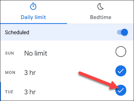 此屏幕上有两个选项卡:“每日限制”和“就寝时间”。我们将从每日限制开始。首先,选择要限制屏幕时间的所有日期。