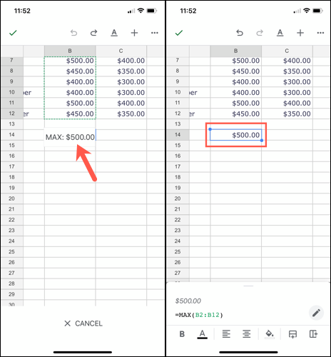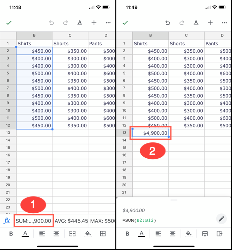 在您的iPhone、iPad或Android设备上启动 Google 表格并打开您的电子表格。选择要计算的单元格。向下看工作表的底部,您会连续看到相同的基本计算。向右滑动以查看全部。