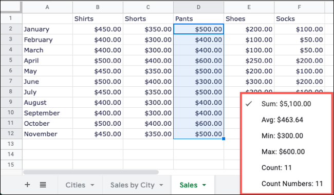 是否有时您想查看数据的快速总和或平均值,但不一定需要电子表格中的公式结果?在 Google 表格中,您可以选择单元格并查看没有公式的基本计算。