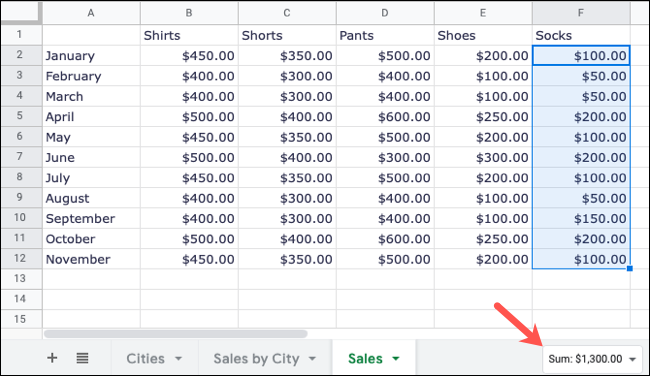 前往Google 表格,登录并打开您的电子表格。选择要计算的单元格。这些可以是相邻或不相邻的单元格。然后,只需向下看 Google 表格屏幕的右下角,您就会看到总和。