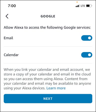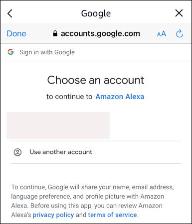 单击“添加帐户”。从 Google、Microsoft 或 Apple 中进行选择,允许 Alexa 访问服务并链接您的日历和/或电子邮件帐户。出于本文的目的,我们将使用 Gmail。