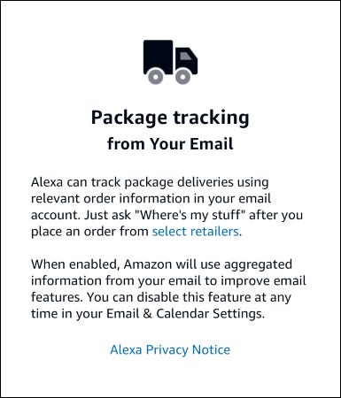 在下一个屏幕上,Alexa 将通过搜索您的电子邮件以获取订单确认和交付状态来帮助您跟踪包裹交付。