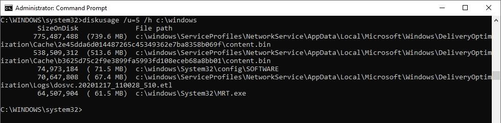 您还可以按文件夹大小对文件夹列表进行排序。为此,您需要使用命令“ diskusage /u=5 /h c:\windows”。