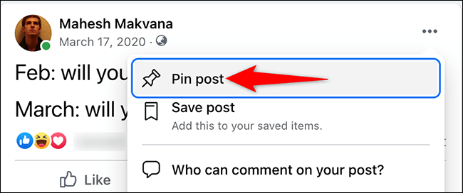 从三点菜单中,选择“Pin Post”。