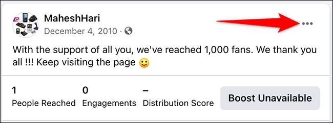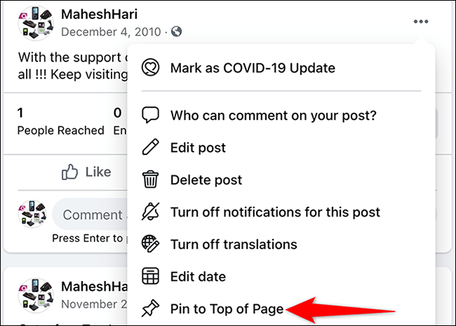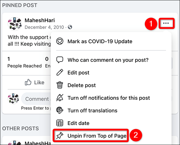 要从页面顶部删除帖子,请从帖子的右上角单击三个点。然后,从打开的菜单中,选择“从页面顶部取消固定”。
