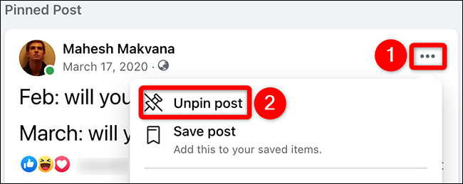 要取消固定帖子,请从固定帖子的右上角选择三个点,然后单击菜单中的“取消固定帖子”。