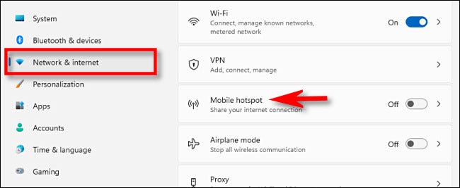 在设置中,单击边栏中的“网络和 Internet”,然后单击“移动热点”(暂时忽略开/关开关)。