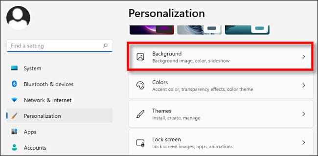 Windows 设置将打开“个性化”类别。在窗口右侧的主要设置列表中,选择“背景”。