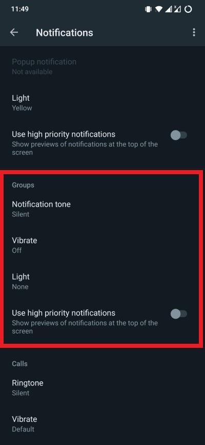 - 向下滚动并在“群组”部分下,确保关闭“振动”,将“灯光”设置为无,并关闭“使用高优先级通知”选项。