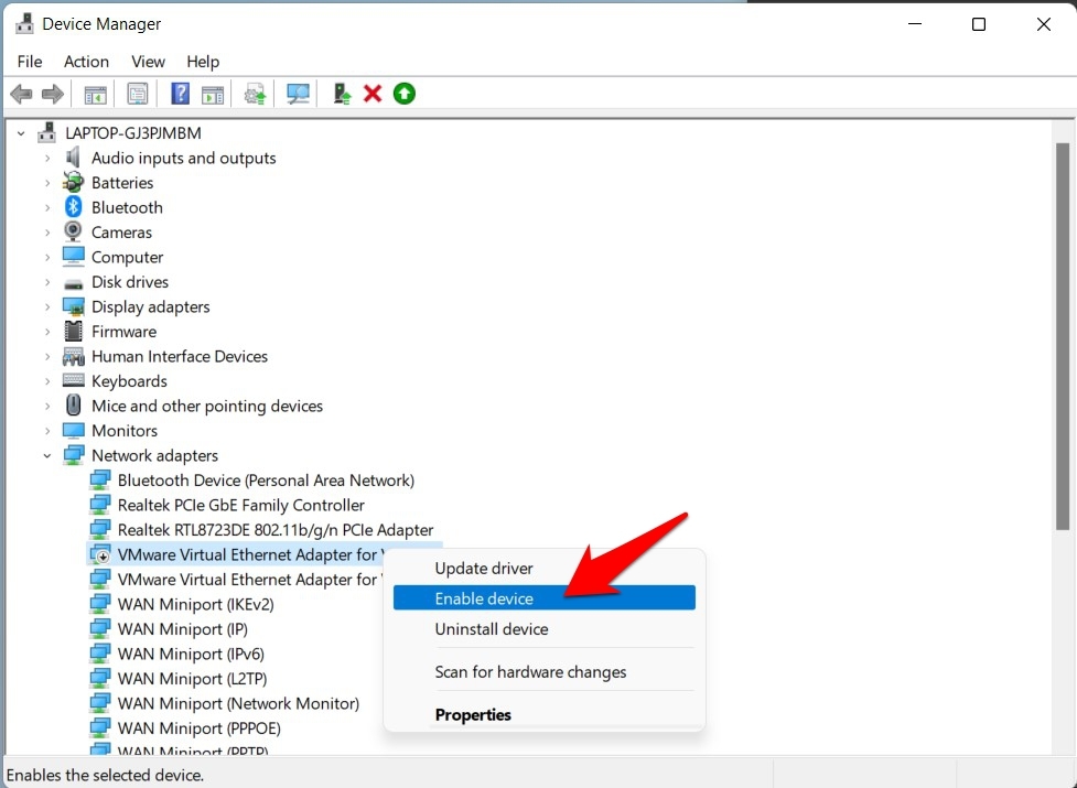 - 等待几秒钟,然后再次右键单击您的适配器。这次,选择启用设备选项。