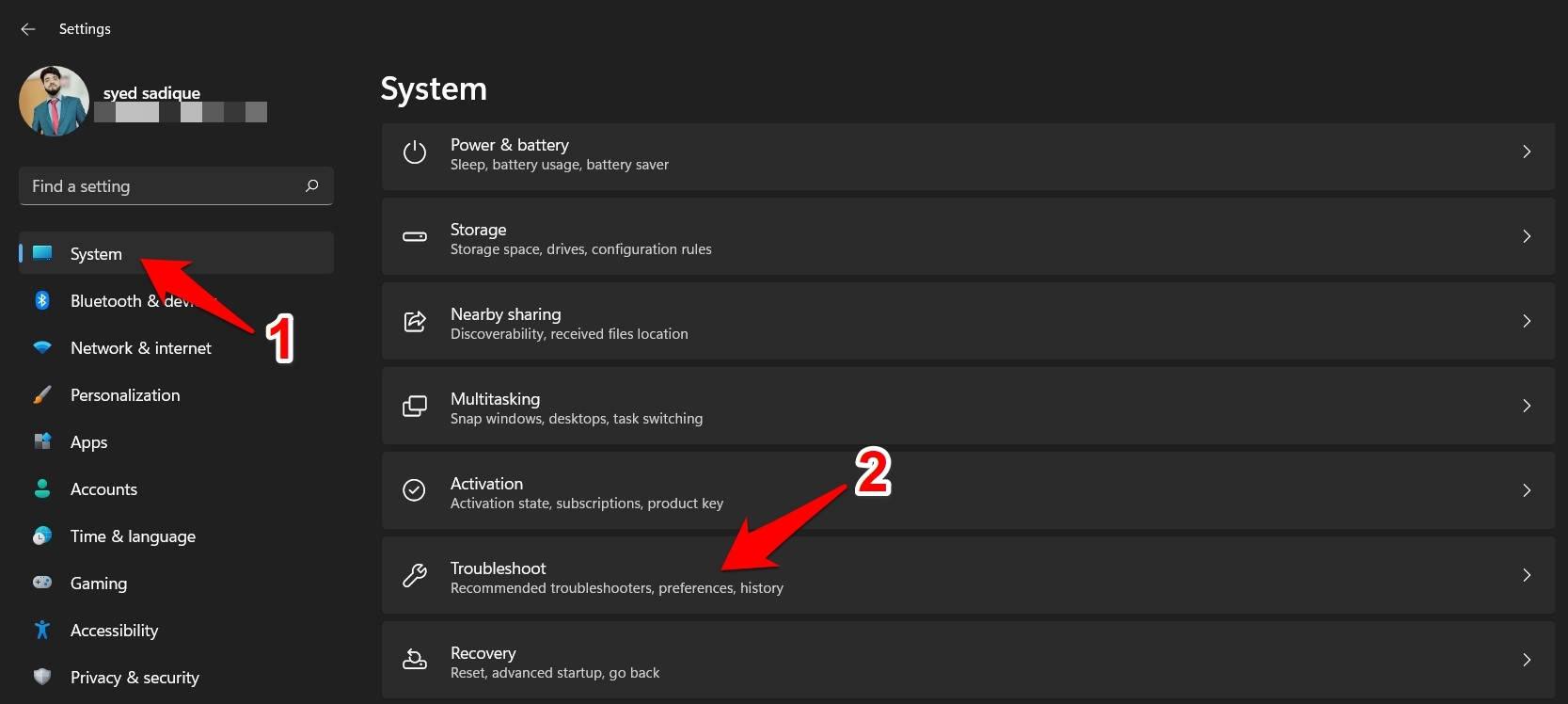 - 然后从左侧菜单栏中选择系统并转到疑难解答部分。