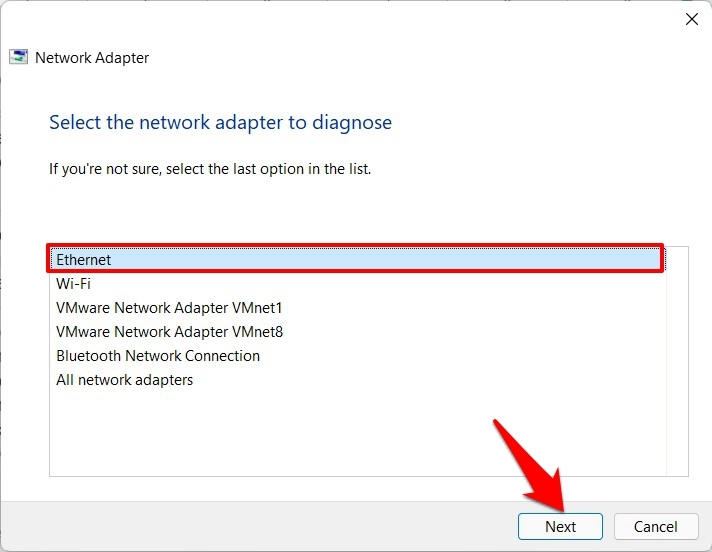 - 从要诊断的网络适配器列表中选择以太网,然后单击下一步。