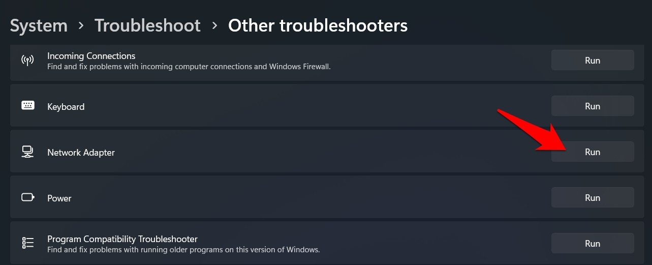 - 现在转到其他故障排除程序,然后单击网络适配器旁边的运行。