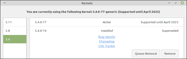 一些发行版允许您以图形方式执行此操作,它们甚至可以让您简单地选择不同的内核作为默认内核。例如,Linux Mint 的更新管理器(如下图)有一个内核设置功能,除了删除不需要的内核之外,它还允许您设置内核首选项。