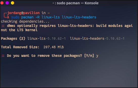 出于这个原因,最好简单地使用替代内核启动,而不是降级您常用的内核。如果您已经启动到另一个内核并且知道您不想使用第一个内核,您可以使用 Pacman 在卸载命令中命名内核。