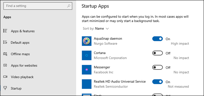 要在您登录时阻止应用程序启动,您可能应该使用 Windows 10 的“设置”应用程序中的“启动应用程序”屏幕。您可以在此处打开或关闭要在启动时运行的应用程序。它运行良好并显示一些不会出现在启动文件夹中的应用程序,但您仍然可以访问它们。