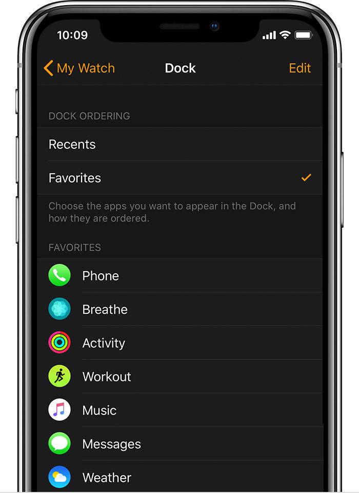 - 点击 编辑, 然后使用 (+或-) 符号添加或删除应用程序。您最多可以添加10个应用。要重新排列应用程序,请点击并按住 应用程序旁边的 三行,然后向上或向下拖动。