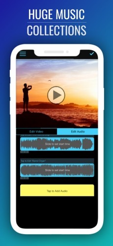 此应用程序专供 iPhone 和 iPad 使用,可让您轻松地将自定义背景音乐或混音歌曲添加到视频中。背景音乐可以从您的 iPhone 以及应用程序的本机曲目列表添加,一旦选择,您将获得选项标记,您希望音乐在视频中的确切位置开始。添加曲目后,您可以调整音频音量、添加淡入淡出效果或您自己的声音到视频中。