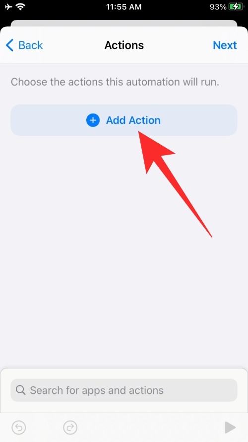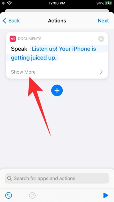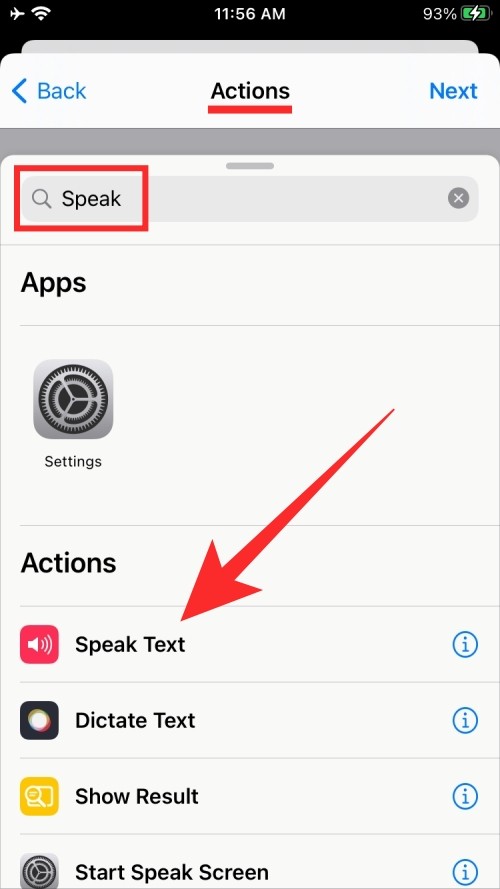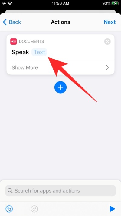 您现在必须为将 iPhone 连接到充电器时创建一个操作。您可以通过点击“操作”屏幕内的“添加操作”按钮来执行此操作。在下一个屏幕中,在顶部的搜索框中键入“Speak”,然后选择“Actions”下出现的“Speak Text”选项。