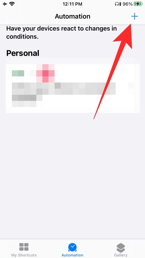 在“自动化”屏幕内,点击“创建个人自动化”按钮(如果您是第一次使用快捷方式自动化用户)或点击屏幕右上角的“+”图标(如果您使用过在此之前的快捷方式自动化)。