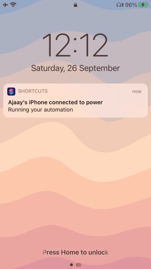 您现在可以将 iPhone 连接到充电器来测试此功能。当您这样做时,Siri 会说出您要求它说的文字,并会显示一条通知,说明您的快捷方式自动化正在运行。
