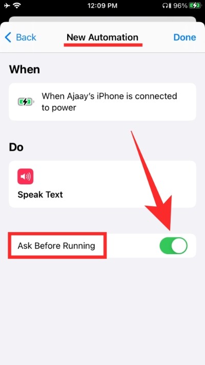 在下一个屏幕中,您需要关闭显示“运行前询问”的开关。这很重要,因为如果您不这样做,每次将充电器连接到手机时,快捷方式都会询问您是否希望自动运行,我们认为这是不想要的。当您关闭“运行前询问”选项时,系统会要求您确认操作,为此,请点击屏幕上出现的对话框中的“不要询问”选项。